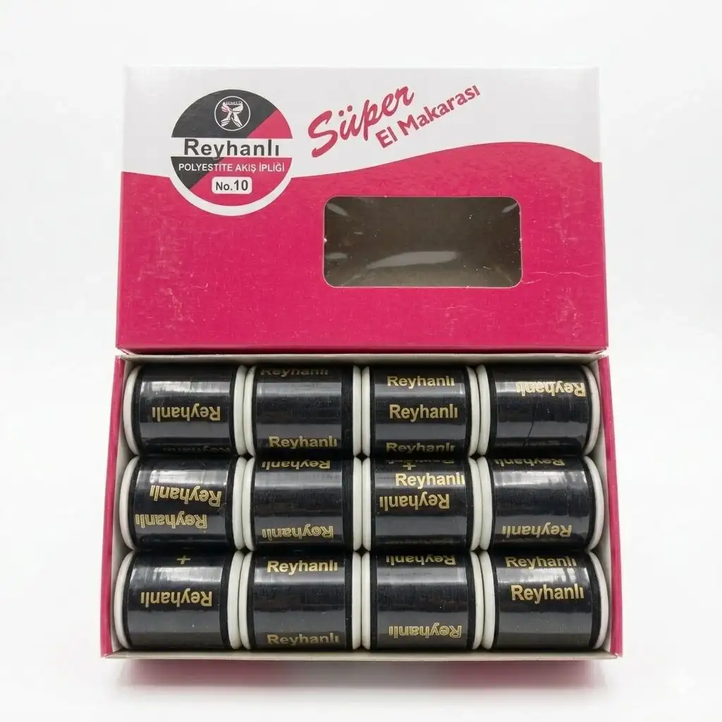 Reyhanlı merserize dikiş ipi kutu içerisinde 12 adet, %100 polyester ipliğinden üretilmiştir. Parlak, dayanıklı ve kaliteli yapısıyla elde ve makinede dikiş için idealdir.