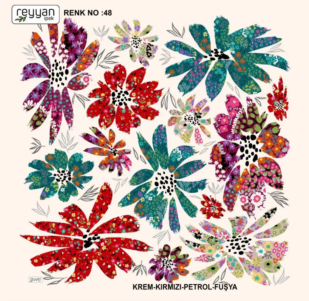 Reyyan İpek Yazma, orijinal parlaklığına sadık kalan canlı ve uzun ömürlü renkler sağlayan birinci sınıf kumaş üzerine 1. sınıf baskıya sahiptir.