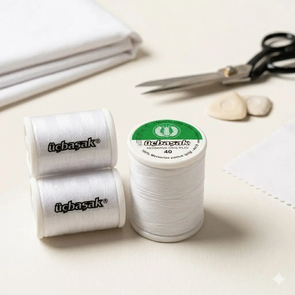Üçbaşak merserize dikiş ipi, %100 pamuk ipliğinden üretilmiş olup yüksek kalite standartlarına sahiptir. 900 metre uzunluğu sayesinde uzun süreli kullanım sunar. Merserize işleminden geçtiği için daha parlak, pürüzsüz ve dayanıklı bir yapıya sahiptir.